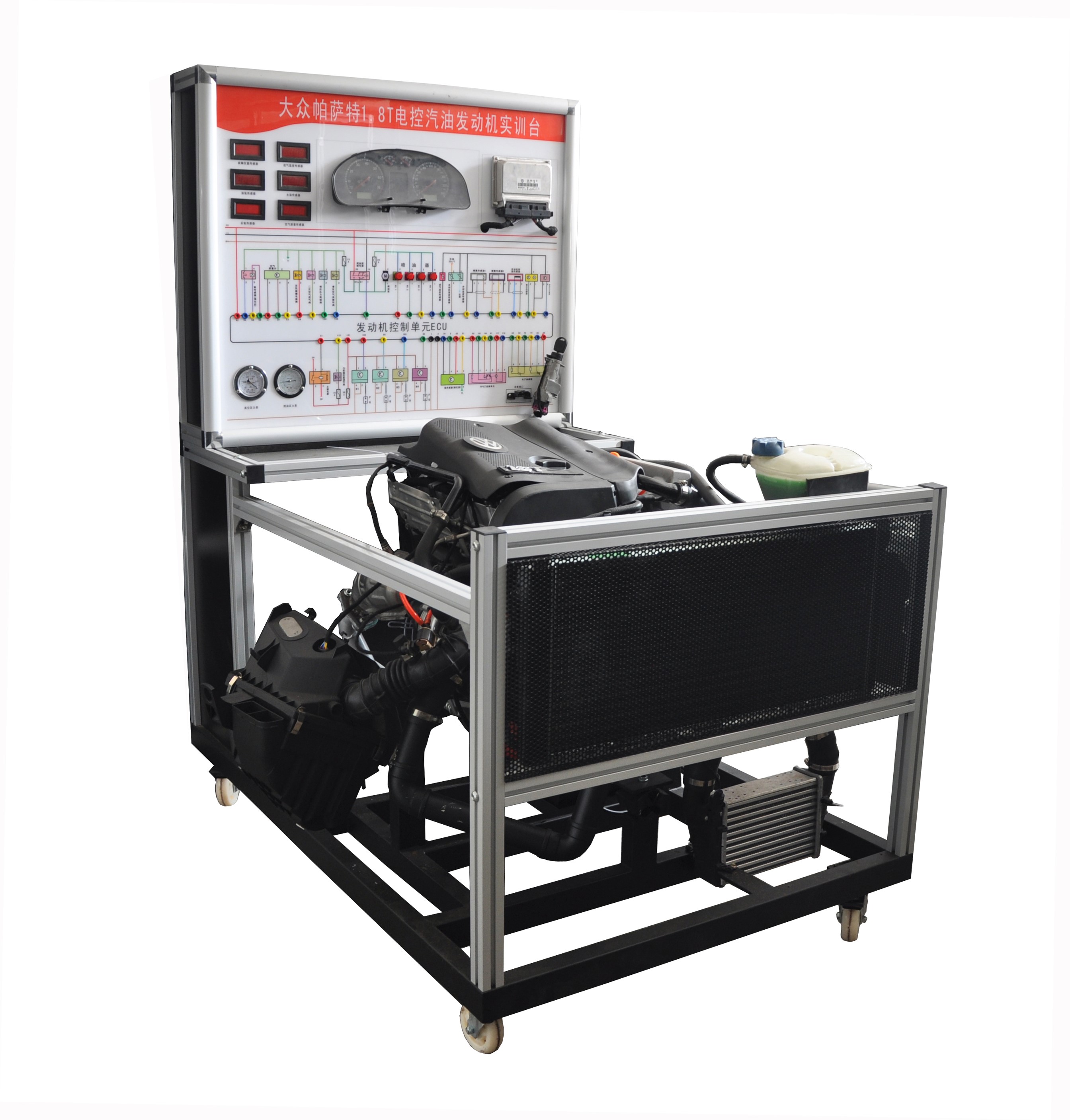2、測量面板:面板上有發(fā)動機(jī)電控系統(tǒng)電路圖和4mm測量端子,通過萬用表或示波器在測昂端子處檢測電路元件的電壓。電阻。頻率或波形;面板上的LED顯示噴油脈寬和節(jié)氣門開度